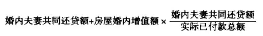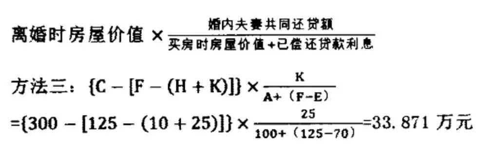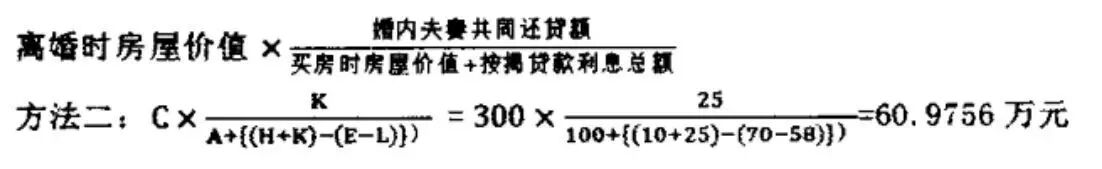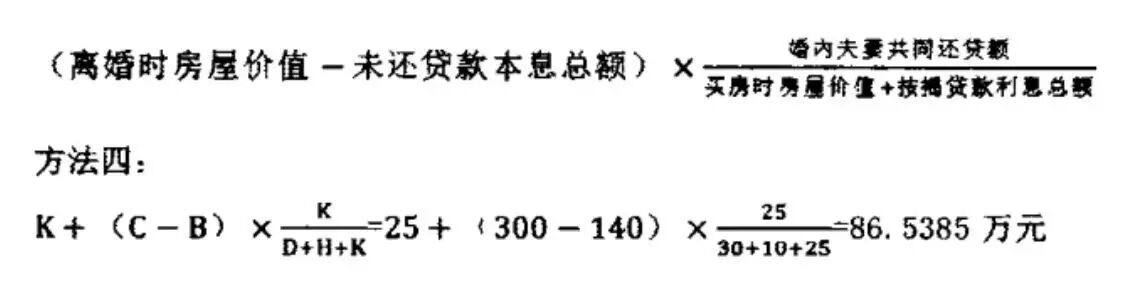 该方法是用婚内夫妻共同还贷额加上房屋婚内增值额乘以婚内夫妻共同还贷额占实际已付款总额的比例。(C-B)是房屋婚内增值额,D+H+K是实际已付款总额。即:
