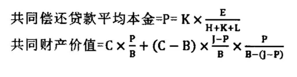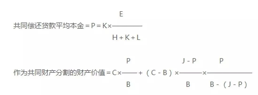 为了使公式看起来更简洁,把共同偿还贷款平均本金公式用P来代表,平均本金账户余额就是J-P。将P和J-P代入前述公式后得出房屋中应当按照共同财产分割的价值计算公式: