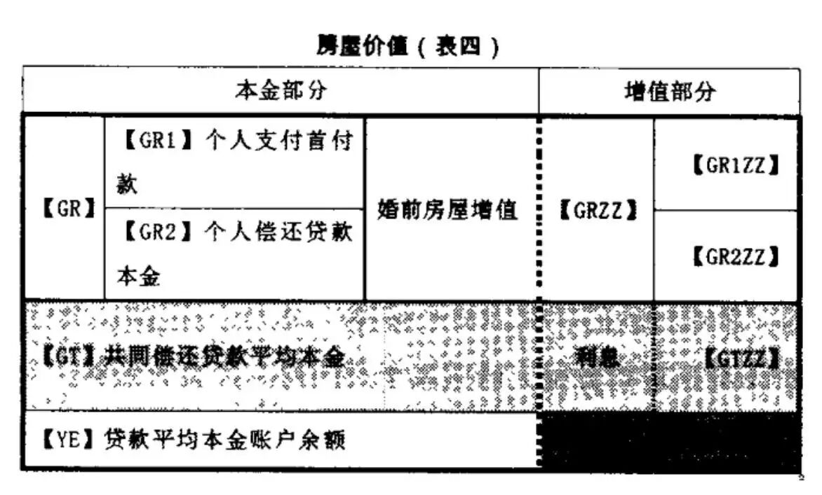 表三是甲个人支付首付款按揭贷款购买房屋,婚前个人偿还部分银行贷款,然后与乙结婚,婚后用共同财产又偿还银行贷款,在尚未清偿贷款的任意时间结点,房屋有一定自然增值情况下的房屋价值构成表。表三与表二和表一的不同主要在于房屋价值的本金部分,表一和表二是把房屋购买总价视为房屋的本金,表三是把甲乙结婚时间结点的房屋价值作为房屋价值的本金。甲乙结婚时间结点的房屋价值中,除去该时间结点的房屋债务外,均属于甲个人所有,由个人支付首付款、个人偿还贷款本金及婚前房屋增值3部分组成,相当于表一的房屋全部价值中除YE区以外的价值。为便于理解,可以假设甲在与乙结婚的时间结点重新办理一笔银行贷款,贷款金额与原按揭贷款账户余额相同,就是表三中GT区与YE区之和,甲用新贷清偿旧贷,那么在甲乙结婚时,房屋的按揭贷款金额就是原贷款的账户余额,结婚时间结点房屋价值减去按揭贷款的数额就相当于首付款,就是表三中的GR区。同样根据前述日常经验法则,表三中GRZZ区是GR区相对应的财产增值部分,GTZZ区是GT区相对应的财产增值部分,GTZZ区扣减GT区的利息是GT区的收益,YEZZ区是GR区和GT区共同对应的财产增值部分。根据按出资比例分配的一般原则,忽略付款的时间因素,按照GR区与GT区的比例可以对YEZZ区进行分配,确定属于共同财产价值的数额。