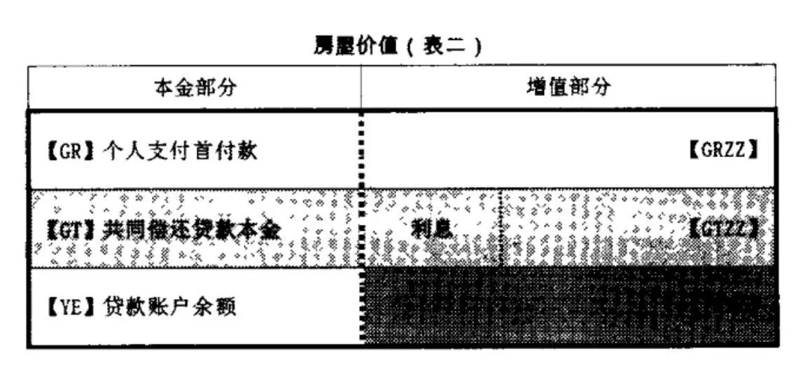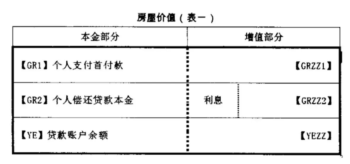 如果把房屋购买总价视为房屋的全部本金的话,房屋本金由首付款和贷款金额组成。个人偿还一定贷款的情况下,房屋本金由首付款、偿还贷款本金和贷款账户余额组成。假定支付一定的房屋本金,就对应一定比例的房屋,则一定比例房屋的增值一定对应该比例的本金。根据这一日常经验法则,可以肯定表一中GRZZ1区是GR1区相对应的财产增值部分,GRZZ2区是GR2区相对应的财产增值部分。由于GR2区是以贷款支付,贷款需要支付利息,但利息并不属于本金,只能算GR2区的成本,GRZZ2区扣除GR2区的利息成本,就是GR2区的收益。