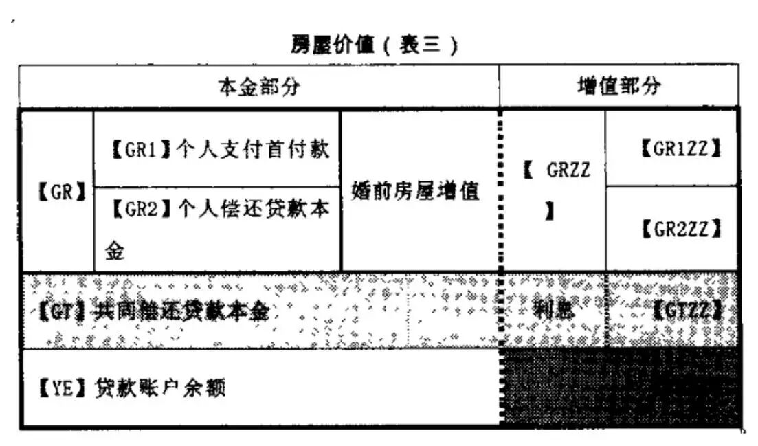 表三中,有浅色底纹的区域即GT区和 GTZZ区,是全部应当按照共同财产分割的区域。有深色底纹的区域即YEZZ区,是一定比例应当按照共同财产分割的区域,这个比例就是共同偿还贷款本金占结婚时房屋价值与离婚时贷款账户余额之差的比例。